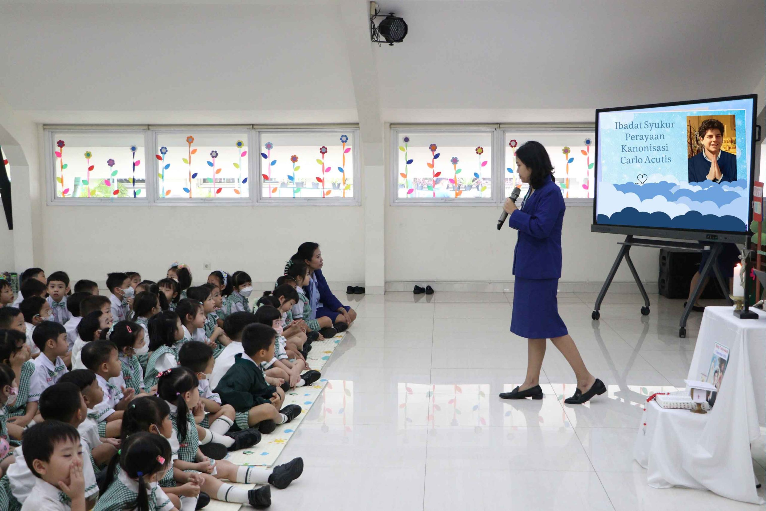 Pada hari Senin, 8 September 2025, seluruh anak TK A dan TK B serta para guru berkumpul dalam suasana penuh sukacita untuk merayakan Ibadat Syukur Kanonisasi Santo Carlo Acutis. Peristiwa bersejarah ini menjadi momen istimewa, karena Carlo Acutis, seorang remaja sederhana yang sangat mencintai Ekaristi, telah diakui Gereja sebagai Santo pada tanggal 7 September 2025. Ibadat ini bukan hanya sebagai ungkapan syukur, tetapi juga sebagai kesempatan untuk belajar meneladani iman Carlo yang dekat dengan Yesus sejak kecil.